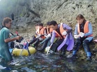 @ しっかりと器材の扱い方の説明です。マスクの付け方やスノーケルの扱い方など陸でもしっかり練習です。ちゃんとマスクのサイズあってるかな?→