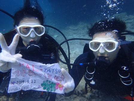 【感想】アクツ様☆海がとてもキレイだった。初めてのダイビングだったが上手くできた。☆アシスタントして頂いたナスビさんの指導がとても分かりやすく、また、楽しんで水中を見れました。☆海がキレイでとても心が洗われました。また潜りにきます。