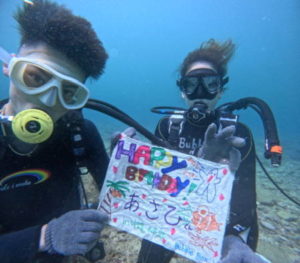 ★誕生日に沖縄に来て初めてのダイビングとても良い経験になったし楽しかったです!!絶対にライセンス取ってまたダイビングしに来ます!なすびさんのサプライズとても嬉しかったです!教えも分かりやすく楽しい時間でした。また絶対に来るので次は遠くまで行って一緒にダイビングしましょう!!ありがとうございましたまたお願いします😊