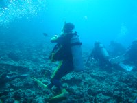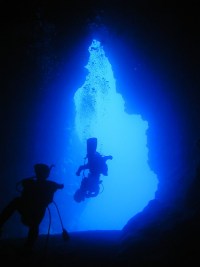 粟国島は 本島から日帰りでいけるようになりました。ここは、上級者向けですね。流れがあるので 基本はドリフトで流します。ギンガメアジが 1000匹以上渦を巻くので有名!2m級のイソマグロなんかも バンバン見れるのがすごい。1つの根に捕まって 大物が通るのを待つ! 渡名喜ブルーホール その蒼さに驚く事でしょう!その他にバブルボックスでは 企画物として1泊2日の粟国島ツアーもあります。那覇からの往復フェリー代・宿泊代・2食・夜は泡盛飲み放題・ダイビング4ボート代込み込み¥39,800です。ギンガメアジが 1000匹以上現れる時期が 5月から7月なので そのあたりで人数が集まりしだい何時でも実施!(この場合チェックダイブあり4ダイブの内1ダイブ)那覇からの日帰りではなく1泊するので のんびり夜は 皆でトークもよし ぶらぶらと島めぐりもよし ダイビングでいうと何よりいいのが ドリフトダイブではなくアンカーロープ沿いに潜行することが出来るのだ!1人からの参加OK! 詳しくはメールか電話でスタッフまで!