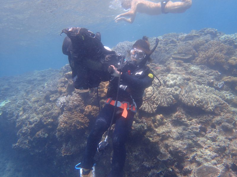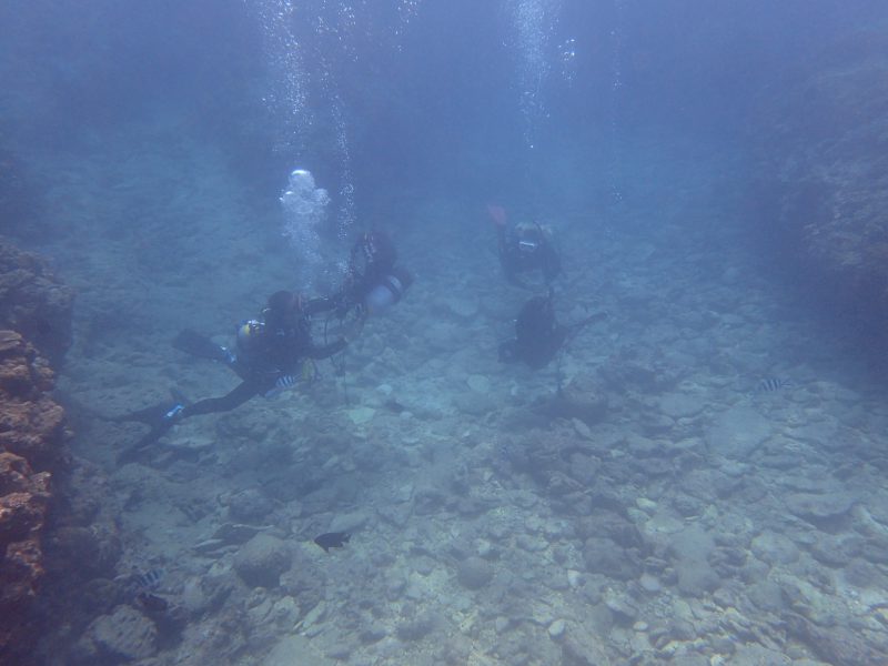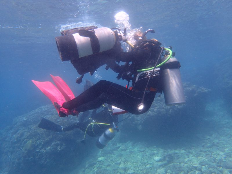 タンクとレギュレーターだけで、お客さんの身体がない状態で潜降させるトレーニングです!
