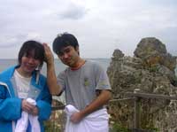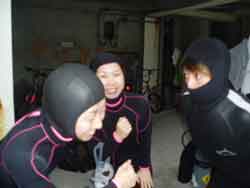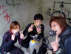 じゃじゃーん。昨日体験ダイビングにきてくれた、きょうこちゃん&みかちゃんです。今日は洞窟スノーケルに挑戦!外海はざぶーんざぶーんと荒れていたので、崖を下って洞窟の中に直行!洞窟の中の海は今日もやっぱり最高のブルー!超キレイだったねぇ。ライトで岩陰にいる魚をさがしたり、素潜り練習もしたね。海からあがった後はうんめぇ〜とお茶を飲み、シャワー代わりに持っていったお湯をかけあってはしゃぎあうナイスキャラの2人です。ライセンス合格報告楽しみにしてるよ。応援してるからね。がんばってね! | |||||