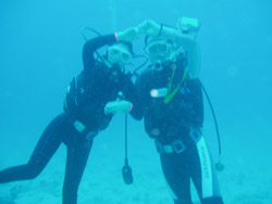 久しぶりの体験ダイビングです。 今日は北海道から来てくれた2人です。札幌は寒いそうですよ。どれぐらい寒いかと言うと タマゴが1ヶ月腐らないほど・・ん!腐らないと言うよりは 凍っちゃうよね!って事で 始まった。体験ダイビング まずは 陸説ですが 2人供緊張していましたね!笑!陸での練習がはじまると彼氏の方は全然余裕でしたが 彼女に方はドキドキして 何度も呼吸の練習をしていましたが ゆっくりしているとそのうち慣れてきました。バッチリになってから 海の中へ 2人供大丈夫!彼氏なんて はしゃぎすぎで 水中観音様を倒しちゃうしまつです。笑!魚もいっぱいで 透明度もよく 楽しかったね。今度はライセンスに挑戦して下さいね。2人なら全然へチャラですよ!!ぷうっ!あ!失礼・・ | |||||