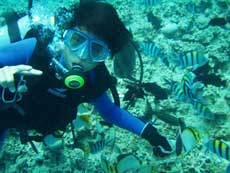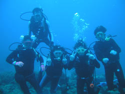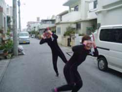 広島からきたナースちゃん2名。ミカちゃんとキョウコちゃんがスペシャル体験ダイビングに挑戦。→の写真のように元気キャラです。2人はライセンスの講習を地元でスタートしているという事で、すんなり海に潜って行きました。念願のニモやギルにばっちり出会えたし、やわらかいサンゴや毒のある魚もみちゃったね。2人は明日は洞窟へ探検です。洞窟の海のブルーの光きっと感動するよ!楽しみだね。ライセンスもさぼらないで、もうひとふんばり、がんばって!そしてまた沖縄の海で遊ぼうぜ!! | |||||
