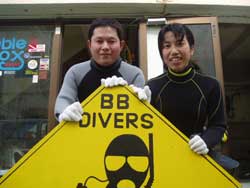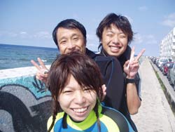 はいさい!今日は北風ビュービュー。でも天気は晴れ!!今日も元気良く行きましょう!!ゲストは昨日に引き続きミゾグチさん!!お久しぶりぶり!横山さんです!癒しのゴリチョでAOW講習してきました!!透明度はあんまり良くなかったけどやっぱ白の砂地はキレイですネェ(^0^)/のんびーーり3DIVEしちゃいました!横山さんはMy器材デビュー!!久しぶりなのにすっごい落ち着いてましたね!!!今日は天気よくてよかったっスネェ!!おっと!ミゾグチさんは今日で卒業だ!ついにベテランAOWダイバー誕生ですね!!これからも今まで以上に潜りまくってくださいね!!おめでとうございます!横山さんは明日もこの調子で頑張りましょう! | |||||