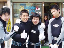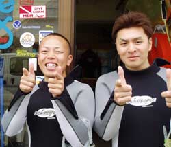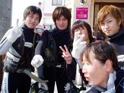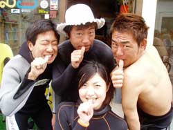 こんちは〜!のりこです!今日は行き当たりばったりの男4人組、ギア(本田君)・かんのき君・越田君・吉田君と体験ダイビングをしました!まずは説明をうけて呼吸の練習をしたあと、水面でももう一度練習をしました!そしてついに海の中へ〜!!最初は呼吸になれず苦しいと言っていた人も、最初から余裕だった人も、チェーンのしたに行ったらみんなはしゃぎまくってたね!!!観音様にもお願い事ができたし、青い魚や白と黒の魚にもいっぱい餌付けをすることができました!!写真はうまくとれてるかな??今度は是非ライセンスを取りにきてくださいね!!!!☆楽しみに待ってますよ〜〜〜♪ |