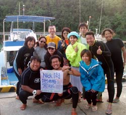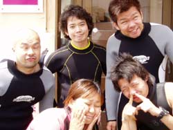 今日はちょっと天気が悪かったけど、気分はバリバリです!今日は7名のお客さんと慶良間に言ってきました!僕が担当したお客さんは昨日に引き続きハルさんとクーさん、そして昨日からアドバンス講習で高橋さんとその友達でジョンさん!!みんなアドバンスダイバーでとても落ち着いていましたね!そして、無事、船酔いもせず三本も潜ってしまいました。どこも透明度最高で、魚もたくさん泳いでいました。これからもたくさん潜って、沖縄の海を満喫してください!それから高橋さんはアドバンス合格おめでとう!!!まだレポートが残ってるけどね〜!!頑張って下さいね ホーリーチームはBB来店2回目!のリンダ&たかちゃん&しのぶちゃんです!自称パニックダイバーのしのぶちゃんでしたが、全くそんな感じではなくかなりリラックスモードでしたね!!アカヤーではしのぶちゃん発見のヤッコエイが見れましたね!!もっともっと自信持ってくださいね〜!!泳いでるムラサキウミコチョウを発見出来るんだから!それだけ余裕があるってことだから!またもう少し暖かくなったらまた来て下さいね!!お待ちしていま〜す!! |