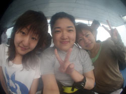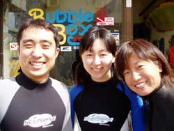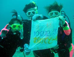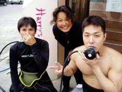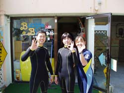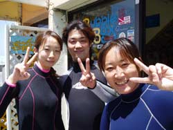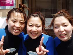 本日の体験ダイビング11時〜は、かわいい女の子3人組!ちゃんぽん、かすてらの長崎から来てくれた、きょうこちゃん、あべっち、さっちです。3人ともスムーズに海の中へ。呼吸も耳抜きも上手にできたね。たくさんのお魚にかこまれたり、観音様にお願いをしたり、う〇このようなナマコも見たね。海にはいって、鼻水もでたけど、楽しいダイビングだったね。また仲良し3人で遊びにきてね!体験ダイビングでもライセンスコースでも大歓迎!また会えるのを楽しみに待ってるよぉ〜。 |