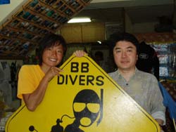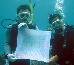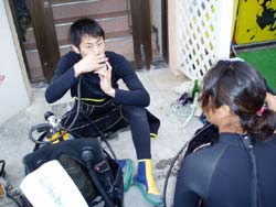 本日、最後の体験ダイバーさんは本番に強い藤本さんと本番には弱いけど、お世辞のうまい川西さんです★始めはてこずっちゃいましたが、それを乗り越えたあとはバッチシでした!ニモも見たし、観音様にお願いもしたし、ウミヘビもあんな間近で見ちゃったし、人間は陸の生き物だと実感しながらも楽しんでくれました♪そして、最後にはπウォーターもいっぱい飲んでムキムキです!もっとムキムキになるためにも、また来て下さいね! |