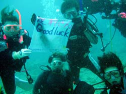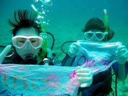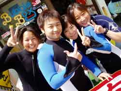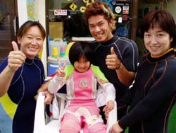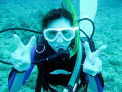 スクール最終日!ついに、この日がやってきました。初日1本目は本当にピヨピヨだった4人が!ん〜〜〜!よく頑張ったね!今日からダイバーの仲間入りを無事・楽しくできました^0^!そんな4名のお名前は チーム・オチムシャのまきちゃんとあゆちゃん!マスク脱着をがんばったみかちゃん!陸ではボケボケなんだけど海の中がバツグンだったゆきえちゃんです。みんな元気で可愛い女の子達でしたよ!そして 今日からダイバーです。これからもダイビングを一生の趣味として楽しくいっぱい潜ってくださいね!沖縄の海でも 待ってるよ〜〜!! |