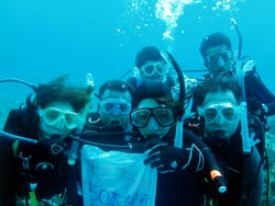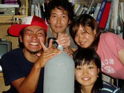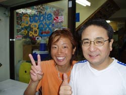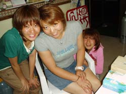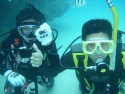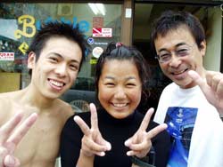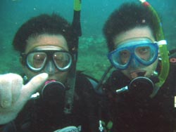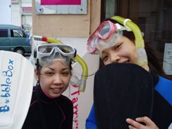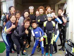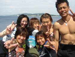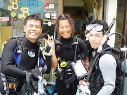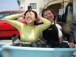 本日午後の3時からは、宝塚市から来てくれた素敵な家族、天満ファミリーです!まずは、海に入る前に練習、呼吸器を加えて、顔をバスタブにはった水につけてイメージトレーニングです。ほほ〜。『水にひたっても息ができるんだぁ〜』ってわかったところで、いざ海へ!!海の中にはたくさんの魚がまってました。真っ青な魚、ぎらぎら銀色の魚、シマシマの魚。和江ママが魚をみてヒャ〜!サンゴをさわってひゅォ〜って水中で声をあげて無邪気に喜ぶ様子がとっても可愛かったです。いつか機会があったら、4人でライセンスに挑戦なんていうのもステキですね。また遊びに来てくださいね! |