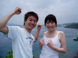 今日お昼からの体験ダイビングは兵庫から新婚旅行で沖縄に来ている村留さん夫婦!ヨシノブさん&カナさんです!!今日この2人のダイビングには目標がありました!それは生まれて2ヶ月の赤ちゃんをお家において来ているため『赤ちゃんに水中でメッセージを届ける☆』という目標です!なんとイイ話でしょう♪とても素晴らしい夫婦ですね!と、いうことで最初から気合満々!!潜ってサカナに餌付けをして水中ハンカチをパシャッと写真におさめました★頑張りましたね!感動しましたよ!次回はハルカちゃんが大きくなって一緒にダイビングができたらいいね♪末永くお幸せに。。。 |
