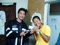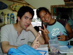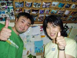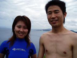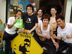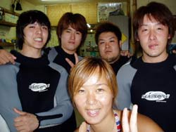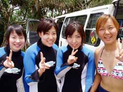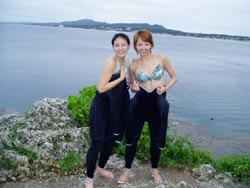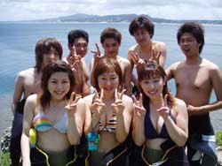 やっと梅雨明けした沖縄です。いんや〜久しぶりにお天道様をおがみました。長かった・・・。 そんなめでたい日にダイバーになった人がいます。1.5日という短い期間でOWに挑戦した兵庫から来てくれた、キャプテンの友達ミキさんです。初日はちょっと荒れ気味の砂辺にエントリー。透明度も悪くてコンディションはあんまりよくなかったけど、頑張ってスキルをやってくれました!!!でも1本上がってあたりが薄暗くなってきてたので、2本目は中止して学課に変更。やる気満々で僕のほうに大丈夫ですか??と心配してくれるほど。そして一気に最終テストまでいって見事学科合格!終了したのはなんと夜11時。ほんとに遅くまでおつかれさまでした。そして2日目はマンツーマンで真栄田岬にレッツラゴー!!昨日とは違って透明度もよかったですね。そして昨日の分を取り戻して頑張って3本潜ってきました!!!そしてラストスキルを終了してオープンウオーターダイバー合格!!!!パフパフー!!!! |