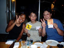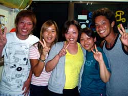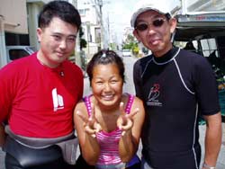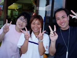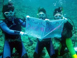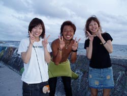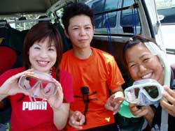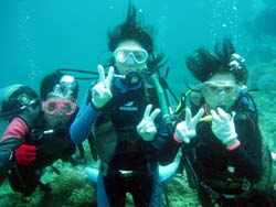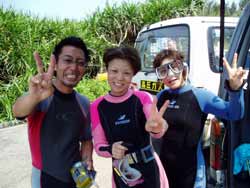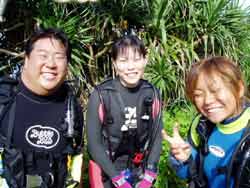 今日もまた 立派なダイバーが3名登場しました!!笑顔がステキなヨウイチ君としっかりお姉さんのえみさん大人っぽいユリちゃんです。とってもみんな 上手くなりましたね!ツバメウオと一緒に空を飛ぶように泳いだり クマノミをゆっくり観察したりそして 今日は 洞窟に遊びに行きましたね!洞窟の周りには スゴイ数の幼魚が群れていてそれに飛び込んで遊んだりしました。これからも 楽しいダイビングを満喫して下さいネ。付き添いで潜ってくれたよしみさんも また遊びにきてよ!待ってるね!!そうそう ヨウイチ君は ダイブマスター目指してがんばるなら いつでも相談してね! |