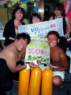 ハイサイ!!メッキリ黒くなりました健太郎です!!今日は張り切って慶良間へGO!!夏らしい南風が吹く中海況はなかなか波が!!でも慶良間に着いたら問題なし!!今日は地形三昧!!その中にはお祝いダイブもありましたヨォー!!さぁ!今日の主役!キーワードはキレンジャイ!!奥ちゃんです!!そして昨日ジンベエを倒してきたゼンチャン&カメちゃん!!写真のおーのさんは別のチームです!さぁ!海はというと!透明度バツグン!!!どのポイントも30mオーバー!!サイコーーー!!しかもいきなり1本目にはカメ!!その距離20cm!!「近っ!」と思わず声が出るほど!!手を伸ばせば届く距離でしたねぇ(^0^)/よし!いい感じだ!次はサメ!!ジンベエの1/10ぐらいの大きさのネムリブカが2匹寄り添ってました!!口をパクパクさせててチョーかわいかったーーー!!今日はいい日だ!!そのはず!3本目に奥ちゃんがついに記念すべき100本目のダイビングでした!!おめでとーーー!!水中ではみんなで胴上げしたりたくさんの人からのお祝いハンカチを広げたり!アオレンジャイからの贈り物のカレーを海の中で発見したり!盛り沢山!!いや〜奥ちゃんは仲間がたくさんいて幸せだねぇ(^0^)/この記念のダイビングに一緒に潜れて健太郎も幸せでした!!次は150本か??200本か??ガンガンイットコーー!!明日も楽しもう!!ゼンチャン、カメちゃんは今日でお別れですね!また早く沖縄に帰ってきて下さいネ!!待ってマーーーす!! |