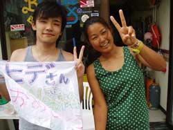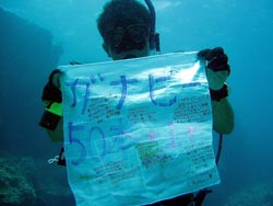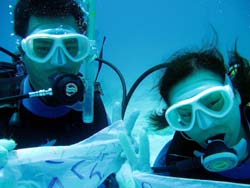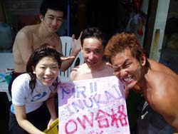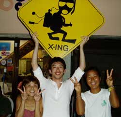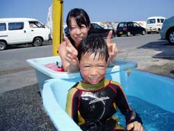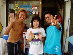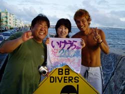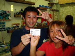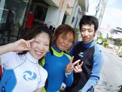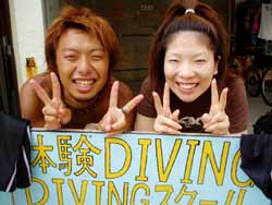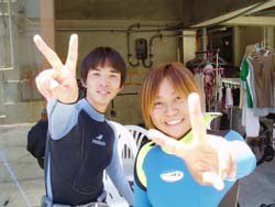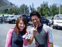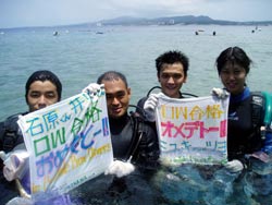 はいさい!!あかねで−す!!あつっーい毎日ですが・・沖縄の海は最高ですよ!!今日は〜OW最終日のプリンスこと王子!!そして、スクール2日目のようこちゃんです!!今日は、スクール最終日ということで、まず1本目にコンパスや中性浮力の練習をしました!!2人とも、なかなか上手に中性浮力とれてましたよ♪♪そして、ラストDIVE☆では泳ぎ方の練習そして、観音様に王子は何やら真剣にお願いして・・・王子の合格祝いです!!そして、帰って学科を終え・・・なっななんとOWダイバーの誕生です!!おめでとーございます!!これで、王子はもぉ立派なダイバーです!!これからも、いろんな海でたっくさんダイビングしまくちゃってください♪♪そして、沖縄の海にもまた遊びに来てください!!また〜一緒に潜りましょうねぇぇー☆☆☆YES・NOゲーム最高です!! |