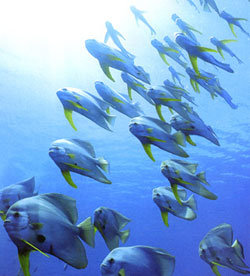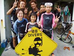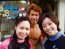 午後から涼しい風が吹いて、紅茶でも飲みたい気分の今日この頃です。そんな中、体験ダイビングに挑戦してくれたのは、宮崎から遊びに来てくれた、元気な女の子三人組!!やる気満々でわくわくどきどきって感じでしたね!説明を終ってスーツを着ていざ海へ!!!!呼吸の練習もばっちりで耳抜きも問題なし!!水中をユラユラ浮遊してるとキビナゴの群れがキラキラオーロラのように光っていました!!あれは感動するよね〜!泳いだりしてると魚を発見して「ウオ―」とか叫んでました。それから餌付けをしたりサンゴを触ったりナマコで一発芸したりとダイビングを満喫しました!!今日は透明度もよくて最高でしたね!!今度は一発芸を考えて遊びに来てくださいね!!笑 |
