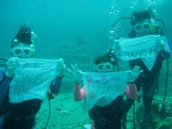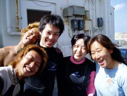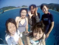 こんちにはぁ☆今日、一緒に潜ったのはお仕事仲間で旅行中のミカさん・ユミコさん・マヤさん・ヒトミさん・アツコさんです!まみ入れて女6人+男ケンタローさんでサイッコ――――の慶良間へ行ってきちゃいましたぁ♪♪♪ミカさん&アツコさんは去年の夏にライセンスを取って以来ほとんど潜っていないため、かなり不安げでしたね。でも、ちょっと復習しただけで立派なダイバーに復活していましたね☆初体験ダイビングのマヤさん&ヒトミさんと体験2回目のユミコさん。ライセンス保持者の2人に比べて不安げよりも楽しみの方がいっぱいでした(^^)実際、海では5人ともスッゴイ楽しそうに泳いでいましたね!!そして2本目!!カメ見ちゃいましたねー★☆★可愛かったぁ!お昼休憩中も船のすぐ間近でカメが呼吸しに水面に顔出してるのを見て、はしゃぎ・・・そのままスノーケルではしゃぎ・・・そのまま3本目に突入(^O^)5人そろってガッツリ3本潜っちゃいました!3本目にはみんな手馴れた感じに準備をし、上手に中層を泳いでいましたね!その調子でライセンス取得!?また5人で遊びに来て下さいねー!!! |