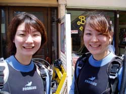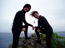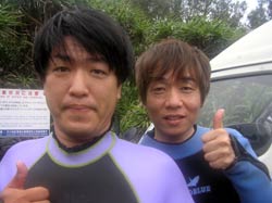 はいどーも!!台風の中勇敢に真栄田岬に戦いを挑んだお二人でーす!いや〜強風が吹く中ドキドキしながら水面で練習しましたが、すんなりと海の中へ・・・・・それも陸でしっかりと練習してた二人の力!!海のなかは楽しかったねぇ!たくさんの魚に囲まれたり、大きな魚にあったり、バブルリング作ってみたり、ニモの親戚クマノミは可愛いし、イソギンチャクはペトペトだっし(笑)。ダイビングって楽しいでしょー!!次はライセンスコースでお待ちしておりまーす!! |