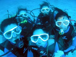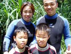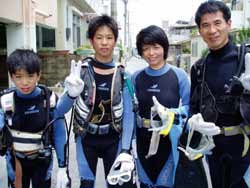 え〜本日もオキナワ晴天なりぃ〜。1時からの体験ダイビングAコースは神奈川県からきてくれた相原ファミリーです。メンバーは優しいナオヤパパ&ノリコママ そして元気いっぱい14才のヒデカズくん&11歳のカナちゃんです。みんなはじめから上手に潜れたね。ニモや二モのおうち、イカやさかさまに泳ぐ魚もみれたね。餌をあげたらいーっぱいのお魚にかこまれたね。初めてのダイビングはどうでしたか?いつか家族全員でダイバーのライセンスに挑戦なんてのもいいかもね。またオキナワに遊びにきてね〜 |