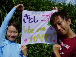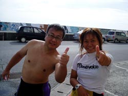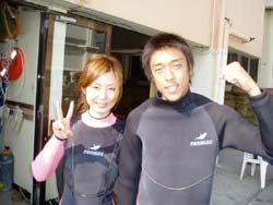 夏も真っ盛り、とぉとぉ今日から8月に突入です!!今日は、昨日・一昨日と3日間OW講習を受けて今日が最終日の☆池内夫妻☆なおさんとたーさんです☆今日は、1本目にたーさんのマスク脱着を気合入れてがんばりました!!最後のマスク脱着は、完璧でした!!感動しました!!そして、2本目☆ラストDIVE☆コンパスで2回目に見事観音様にゴール!!カクレクマノミを見たり、お花畑の上を泳いだり、最後の穴の中の魚の数には圧倒されましたね!!そして見事OWダイバー合格です!!おめでとーございます!!今日から、2人は立派なダイバーです、これからもどんどんダイビングしてくださいね!!この3日間ほんとーにがんばりました!!真栄田の階段や沖縄の日差しに負けず・・・2人はダイバーになりました☆これからも、仲良し夫婦でいろんなステキな海に潜りに行ってください!!そして、また〜一緒に潜りましょうねぇ♪♪誕生日プレゼントも☆ありがとぉぉーございました!!OWダイバー合格おめでとーございます!! |