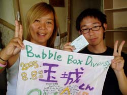 15時からの体験ダイビングスペシャルコースはナイスカッポ―ゥなお二人文子&和光くんです。天然きゃらが可愛い、あやちゃんはけっこう頑張りやさん。口での呼吸がはじめは少しむずかしかったけど、魚にかこまれたら、ドンドンにこにこお目目に。。耳抜きも上手にできたね。そのあやちゃんをみまもるワンパク和光くん。和光くんははじめから余裕!問題なーし。 リアルニモや観音様、やわらかいサンゴや魚の群れ本日の最終の部だったのでノンビーリいつもより長〜く潜ってしまいました。最後は空飛ぶ感じでふわわわぁ〜んって泳いで楽しいかったね。初めてのダイビングはどうでしたか?時々BBホームページのチェキラよろしくね。時間があったら、掲示板なんかも参加してね〜。また潜りにきてね〜。まってるよぉ〜。 |