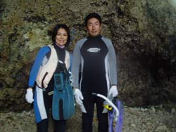 ★★★Merry X`mas★★★ということで♪今日は〜大阪から遊びに来てくれた★ラブラブ★カップル★ゆかりさん&ゆうきさんと一緒に洞窟スノーケルに行って来ました!!今日も火曜サスペンス並みの崖を降りて洞窟まで行きました!!がんばって行ったかいもあり、洞窟は透明度ばつぐんでした☆☆☆洞窟の〜奥にはキラキラ光る魚の群れ×2☆★リュウキュウハタンポもかなりの大群ですんごーいきれかったですね!!洞窟も〜蒼い光がきれかったぁぁー!!また、来年はぜひダイビングしに遊びにきてくださいね☆ |