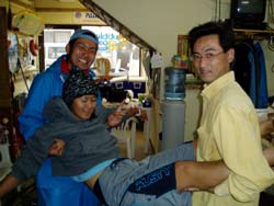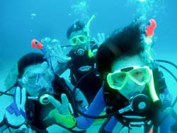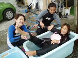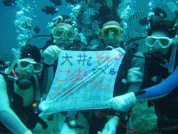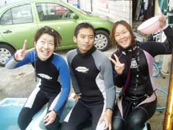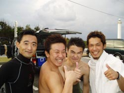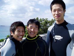 今日二回目の体験ダイビングは山口県から遊びにきてくれた、山村さん、西村さん、魚谷さんの3名です!!かなりハイテンションな3人は今回社員旅行で遊びに来てくれている自称「海の男」そんな3人は初ダイビングなのに超リラックス。水面の練習もばっちり決まっていざ海へ!!入るとたくさんの魚が寄ってきてえさをぱくぱく食べてましたね!!それから水中一発芸大会!なかなか、いけてましたよ〜!!という事でみんなさらに「海の男」に磨きがかかったと思います。今度はライセンスも挑戦してみてくださいね!! |