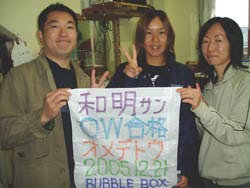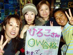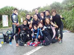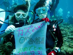 こんちにはぁ☆今日は4人のダイバーさんが誕生しました!!おとといから3日間頑張ったメンバーは大井くん・アベにぃ・こまちゃん・そんちゃんです!大井くん・アベにぃ・こまちゃんは職場の仲間でそんちゃんはこまちゃんのお友達、男性陣とはこの旅行が初対面というメンバー。しかしそんな様子はまったくなくテンションの高い元気な4人でした。4人とも今回がダイビング初めてで初めはドキドキ。なかなか呼吸に慣れなかったり、水中であせっちゃったり、耳抜きにてこずっちゃったり、思うようにバランス取れなかったり、などなど・・・たくさんの難関をくぐってきた!見守ってきた4人です!本当に3日間お疲れ様でした!!そして、ついにダイバー★☆★合格★☆★おめでとぉ〜♪♪次は来年の夏かな?あったかい、あったかい沖縄に遊びに&潜りにぜひぜひ来て下さいね!スタッフみんなでお待ちしていまぁす(^^)そんちゃん!薄いキャラたちじゃ全然なかったですよ(笑)次回は大井くん企画の特典が楽しみだねぇ〜(笑)ではでは、よいお年を〜!! |