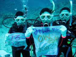 どーもー!!今日は31日こと!大晦日でーす!今日のメインは年越しダイブですが!前哨戦としましてみんなでボートダイビングをしてきました!!メンバーはまず!我らがBOSSトモさんチーム、チーム絆こと健太郎さんチーム、チームワンタンとそしてアカネチームに別れて楽しくダイビングしてまいりました!一本目は恩納ポイント!ここは穴やクレパスなどがたくさんあってすごーく楽しかった〜!でもなんと言っても最後のオマツ!祝100記念のセレモニーは楽しかったねぇ!!皆上手ーくやれたしね!オマツは皆から祝福されて幸せものだね!これから200!300本と目指して楽しく潜ってね!本当にオメデトー!!さぁ!二本目はアポガマというポイントに行きました!ここはドロップオフがあるダイナミックな地形ポイント!まず皆が水底に集合いしてここではカズちゃんのOWの卒業祝いのセレモニー!担当していたトモさんと一緒に写真を撮って拍手喝采!三日間お疲れ様!そしてオメデトゥー!そして連続でめでたい事が!奥ちゃんが150本を迎えました!!これも皆で盛大にセレモニー!!大集合写真を撮って皆でお祭り騒ぎ(笑)。っということはあとちょっとで200本!!ん〜すごい!そのときはまた皆でワイワイ騒ぎながら祝おうね!!でセレモニーは終わったかな?と思ったらボンさんの背中から何やら白い物体が・・?それは何とお客さんからうちのBOSSトモさんに向けたありがとうのたくさん詰まったティーシャツでした!!トモさん大喜び過ぎて我慢できなく水中で着ちゃいました(笑)。なぜか俺らスタッフもすごくとっても嬉しかったです!その後もトモさんは嬉しそうにずーっと上がってからも着てましたよ(笑)。一緒に水中で祝ってくれた皆様ありがとうございました!!次は夜になってから年越しダイビングだ!四年越しの思いは砂辺に届くのか?!こうご期待! |