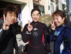 こんちにはぁ☆今日は3日間頑張ってきた2人のダイバーさんが誕生しました!!博子さん&美穂さんです♪♪そして、博子さんのお友達ですでにダイバーのさおりんと4人で慶良間に行ってきました。港〜慶良間の道中はジェットコースター並みの揺れで大変でいたが潜ったポイントはどこも穏やか(^^)まず1本目はトウマ。いかにも『沖縄!』な水色のキレイなデバスズメダイを見たり、さおりん念願の地面から顔をだすニョロニョロを見ました!2本目はアリガーケーブルで博子さん・美穂さんのOW合格ダイブ。おめでとうございまぁす!!!!!「Hello!!」と聞こ・・・えないケーブルや「も〜。」と鳴・・・かないウミウシに耳をあてたりしてみました(笑)そして、寒さにも負けずに3本目!真っ白い砂地のきれいなドラゴンレディ。透明のエビや骨まで見えるスカシテンジクダイを見たり、のんびぃ〜り・ふわふわ漂ってみたり・・・今日は透明度もそこそこよくってキレイでしたねー!楽しかったですねー!みなさん今年は潜り納めかな?来年もぜひぜひ潜りに来て下さいね☆楽しみに待ってまぁす♪♪ |