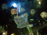 はいさい!健太郎です!今日はにぎやかにたくさんの人数で恩納村のボートダイビングに行ってきました!!メンバーは!チーム坊主!奥ちゃん!シオちゃん!マサミ!オマツ!ひろあきチーム!けいこさん!すがっち!スギメさん!丸山さん!アカネチーム!永P!さっちゃん!ケムケム!総勢11名!!賑やかでしたよぉー(^0^)/まずは癒し系ポイント「クロスライン」へ!ここではのんびりハゼを観察したりトウアカクマノミに襲われたり、砂地をのんびり泳いだりしてきました!気持ちよかったー!!そしてこのダイブでマサミが記念すべき100DIVE!!おめでとー!!水中ではみんなでお祝い!ジュースを飲んだのはすべて健太郎ですが...。ウイダーインゼリーでも乾杯しました!マサミはあっという間に100本だね!これから200!300とガンガン潜ろう!!さぁ!2本目は夢の穴「万座ドリームホール」です!今日も縦穴をくぐり抜け!真っ青な出口へ!今日も蒼かった!きれいだった!マジで最高だったね!何回見てもいい!みんなしっかりお願い事はしましたか(^0^)/いい事があるといいですねぇ!洞窟を出てからもきれいな魚たちに囲まれながらがけっぷちをあがり、根の上で事件はおきました!このダイブで実は人妻シオちゃんが200DIVE!?いやぁ〜おめでとーー!!今日はめでたいことが続きますなぁ(^-^)/ここでもみんなでお祝いです!いやぁ〜まだまだ裸でもいけるね沖縄の海!余裕!オマツのジュース一気も見事でした!マサミ!しおちゃんおめでとーー!!これからもよろしくねぇ!!と!ラストはこの時期にしては珍しい「真栄田岬」へ!やや波はあったものの久しぶりの洞窟をたっぷり堪能してきました!今日は3本ともほんとに気持ちのいいダイビングでした!!この調子で明日!大晦日も張り切って!元気良く!気合入れて潜りましょう!!お疲れ様でしたーー!!年越しダイブができますように.....。 |
