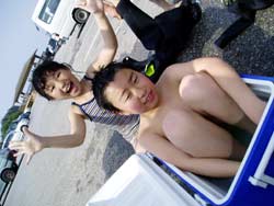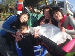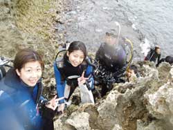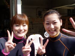 福岡から来てくれた、元気でかわいい女の子、まっきー&まゆちゃんの体験ダイビングでーす。海は大好きな2人!でも初めてつける水中眼鏡に、はじめはちょっぴり苦しい気分。。でもダイジョーブさぁ〜。練習していくうちに、すぐに上手になったさぁ〜そして、本物のニモに御対面!!オレンジでちっちゃくて可愛いかったね。水中写真もいっぱいとったぞ〜!4月からはお仕事がはじまるね。お仕事はりきって頑張ってね!仕事に疲れたら、沖縄の海のキレイさをときどき思い出してね。。また、遊びにきてね〜。 |