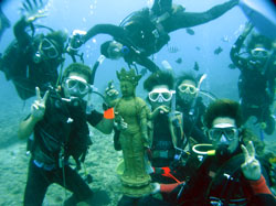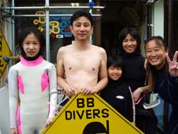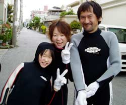 本日9時〜は、ななんと札幌からお越しの渡辺ファミリーの体験ダイビングです。メンバーは 純パパ&洋子ママそしてキュートな彩絵ちゃん(10歳)です。 冷静かつこまめに耳抜きをするさえちゃん!なかなか上手いぞ!お魚にえさをあげたり、水中写真をとったり、楽しかったね。そしてなぜか、海の中に金色の観音様が。。。あの観音様は沖縄の海でみんなが楽しく遊べるように見守ってくれてるんだよ。健太郎兄さんの一発芸「バブルリング」もかっこよかったね。また沖縄にきたときは、遊びにきてね。 |