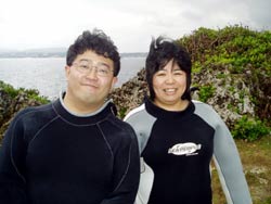 ハイサイ!RYOKOです。今日は洞窟スノーケルに行ってきましたよん。11時の部に参加してくれたのは、どんちゃんこと仁野雅之さん&ひろきちこ杉本裕美さんです。とーってもやさしい笑顔がステキなお2人です。お2人のやわやかな雰囲気にRYOKO癒されました〜(^^)、お天気は雨ではあったけれど、洞窟のブルーはいつも通り美しい!琉球ハタンポの群れもワッサーとテンコ盛りでした。水底を泳ぐダイバーの吐いた空気が昇ってくるのも奇麗だったさぁ〜。どんちゃん、ヒロキチさん、残りの沖縄旅行も楽しんでね。私もビオスの丘行きたいなぁ〜。 |