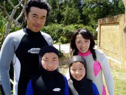 本日9時〜は横浜からお越しの加藤ファミリーの体験ダイビングです。メンバーは 優しい達生パパ&篤美ママそしてかわいい麻穂ちゃん(13歳)&美和ちゃん(9歳)初めは生まれて初めてのダイビングにドキドキだったけど、うーんみんなナカナカ上手いぞ!水深8メートルまでもぐっちゃった!そして、本物のニモに会えたね、ニモのおうちのイソギンチャクは、ふにゃふにゃ〜ってやわらかかったね。エサをだすと、たくさーんのお魚が寄ってきました。初めてのダイビングはどうだったかな?また沖縄にきたら、遊びにきてね!! |