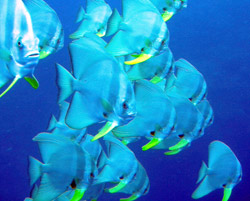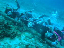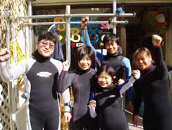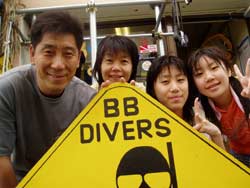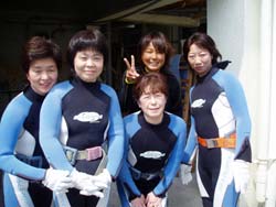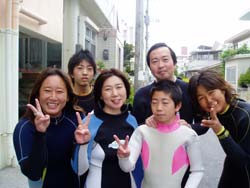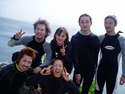 本日9時〜の体験ダイビングはワイワイ6名でにぎやかでーす。メンバーは中島かおるちゃん、山下純ちゃん、池口朱鳥さん、米山拓也さん、多田政彦さん、鈴木規浩さんです。社員旅行の自由行動の今日を利用して参加してくれたそうです。お店での説明を終えて海へ移動!ガヂガヂの崖を慎重におりて着水!基本練習をしてから、いよいよダイビング開始!少し進んだところで、キラキラのキビナゴの群れ、そして次にツノダシ(黄色と黒と白のサカナ)の群れ、三角形の大きい魚、ツバメうおに餌をあげたりもしました。初めてのダイビングはどうでしたか?みんなと潜れて私も楽しかったです。体験ダイビングででも、ライセンスゲットででも、また是非是非遊びにきてね!掲示板参加もよろぴくね。 |