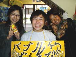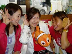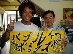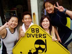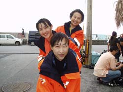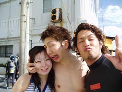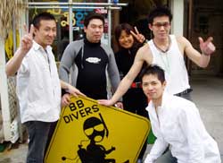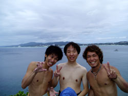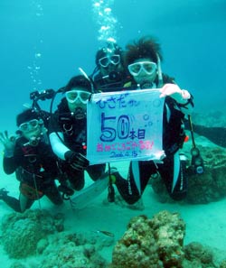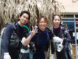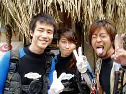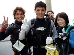⇒写真やっばーい!!DE部チーム?にならないように、めいっぱいおなかをへこませて写真をとったら、顔がへんてこになってしまった。。。こんな撮影にちゃーんと付き合ってくれる、ノリのいい3人は、広島から来てくれた、トシオさん、バックさん、カトタカさんの3人です。さすが、男性人、余裕!耳抜きだってバッチリです。かわいいニモちゃんに癒されたり、写真をとったり、おちゃかなに餌をあげたり、観音様に、金&女の願い事をしたり。。沖縄でのダイビングはどうでしたか?また遊びにきてよ〜。P.S.バックさん、デ部入部には、もう少しラードが必要ですよ〜(^^) |