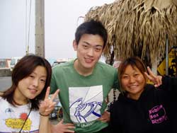 本日午後からの体験ダイビングは、現在沖縄に大学で移住しているチグサちゃんと友達のヤスコちゃんの二名!!そして真中に写ってるイケメン!?のアシスタントしんのすけ君と3名で潜ってきました!!!二人とも初ダイビングにわくわくしてたね〜!!練習も上手ですぐに水中に入れました。餌付けして寄ってくる魚の数にびっくり!!ちょっとパニックになるくらいね(笑)その後もスイスイ水中を泳いでいました。せっかく沖縄に住んでるんだからもっと潜ろうぜ!!また遊びにきてね〜★今度はしんゆう君も連れてきてね〜☆★ |