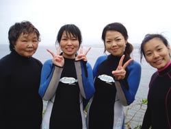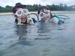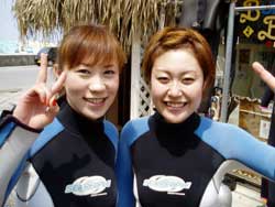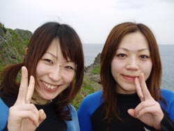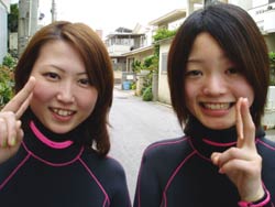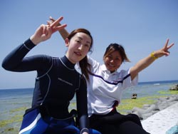 本日最後の体験ダイバーは、岐阜県から遊びに来てくれた、かおりちゃんとさゆりちゃんでっす!ちょっと曇ってきたけどテンション上げて潜ってきました!陸上ではなかなかの天然ぶりを発揮していた二人でしたがいざ海に入ると上手に潜ってましたね。水底でごろごろしているナマコと遊んでみたり、やわらかいサンゴ触ってみたりl水中を満喫したみたいです!!ちょっと寒かったけどね!!今度はもうちょっと暖かい沖縄に遊びにきてね〜☆ |