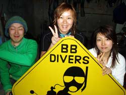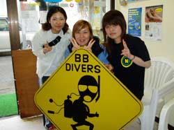 ほいほい〜本日2度目の体験ダイビングでっす。遊びに来てくれたのはBB3回目の佐々木さんとダイビング初挑戦の中屋さんです!!夕方だったので人も少なくて透明度もよかったけど潮が引きまくってドロップオフまでとことこ歩いていくのがきつかった・・・。でも二人はガツガツ歩いてバコーンとエントリー^!!それから大量の魚達に餌付けをしたりソフトコーラルを触ったり楽しみましたね!佐々木さんそろそろライセンスゲットしましょう!!中屋さんステキな忘れ物ありがとうございます!!次来る時までとっておきますね(笑) |