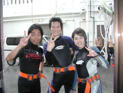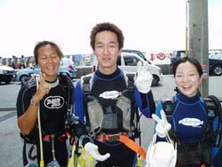本日二組目の体験ダイバーは俺の愛弟子!?のヒロッピーがあかねちゃんと友達のセイ君とリョウコちゃんと遊びに来てくれました☆午後の砂辺は雨も上がってたまに晴れ間が見えてきましたよ!!日ごろの行いかな??心配していた透明度も回復して魚もうようよ泳いでいましたよ〜!!リクエストのソフトコーラルもしっかりさわったしニモにも挨拶してきました。ヒロッピーのちょっとお下品な一発芸も炸裂したし(笑)今度はライセンスにも挑戦してみてね!!また遊びに来てくださ〜い☆ |
