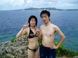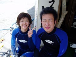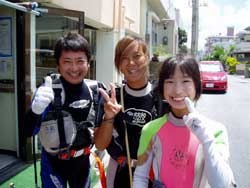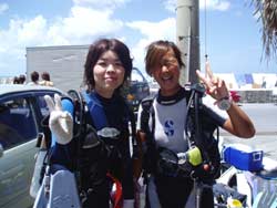 今日も海は、めくるめく穏やか〜♪ THEベタ凪!!みずうみのようです!さぁ〜て11時からの体験ダイビングに参加してくれたのは、、青森からお越しの畑山渉さん&三浦陽子ちゃんです♪2人とも生まれて初めてのダイビングで最初はちょっぴり緊張の様子でしたが、海にはいったら、スイスイすいーー!って泳いでたよ。なので、シーサーがいるところや、ニモがいる深さまでいけちゃった。海の中から見る水面はきらきらしててとってもきれいでした。水中写真とれてたかな〜。2人の写真をとりたいのに、おサカナが多すぎて〜。。。オキナワは1年中潜れるよ。またいつでも遊びに来てくださいね。 |