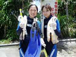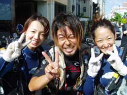 まいど〜ひろあきです!!体験ダイビングフェスティバル二組目は岐阜県から遊びに来てくれた、グラビア志望!?のアユミちゃんとカナミちゃんです!!二人とも初めてで説明の時はかな〜り緊張していたけど水中に入ったらニコニコしていたよね〜☆でもあゆみちゃんはサカナが苦手らしく餌付けでよってくる魚からはちょっと逃げていたけど(笑)やわらかいサンゴにも触ることができたし水中を満喫しましたね!!また沖縄に来た時には遊びに来てくださいね〜★☆ |