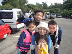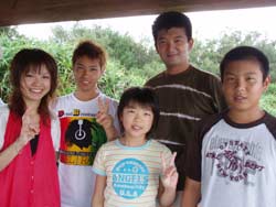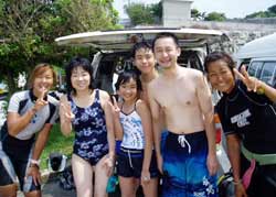 WE WENT TO THE CAVE!本日10時からは洞窟スノーケルへGO!大平一家優しい大平パパ・ユミさん・ミキちゃん・エミちゃん&ニューヨーク在住のジャックとマシューです。入り口だけ波があったけど、そこは、根性でのりこえおだやかな沖のコースを魚に餌付けをしながら、洞窟へぐんぐんおよいでいきました。みんなとっても上手です。洞窟の入り口には、リュウキュウハタンポの群れがキラキラしてました。しかーも、水面はライトをあてているかのようにブルーに光っていました。そして、最後は崖のぼり!火曜サスペンス風味の崖を、ガシガシのぼって、帰ってきました。大平さんチームはこのあと、ダイビングにも挑戦!沖縄の海を満喫ですね。ジャックとマシューは次の月曜日いよいよダイビングに初挑戦!楽しみにまってるよ〜(^^) その後、大平さんFamilyは体験ダイビングへ!