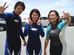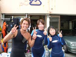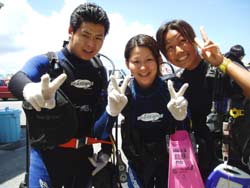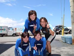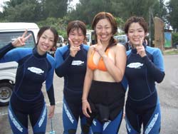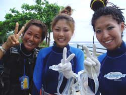 本日11時からは元気な女のこ3人との体験ダイビングです。メンバーはもっちぃ〜こと持光由加里ちゃん&まさみちんこと、西谷真沙美ちゃん&かすみん(ジャスミン?)豊岡香純ちゃんでーす。バレーボール部だったという3人、うんうん体育会系の香りがします。だって海の中もとっても元気!3人とも海中でぐるぐる回転したよ〜!イカにだってタッチ!できちゃうツワモノです。本物のニモをみたり、観音様におねがい事をしたり。穴をくぐったり。。そうだ、観音様へのおねがい。叶うといいね。v(^^)v沖縄の海の中はいかがでしたか?また遊びにきてよ〜!ライセンス3人ならばっちりとれるよ!りょうこ保障するっす!みんなと潜れてたのしかったよ。またあえますように。。 |