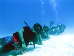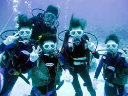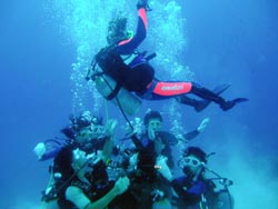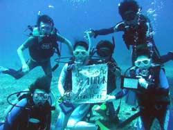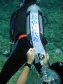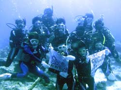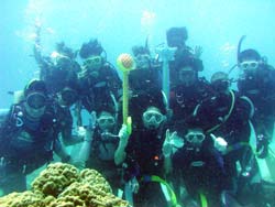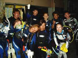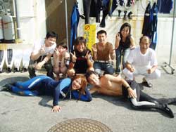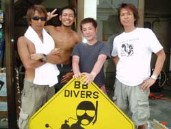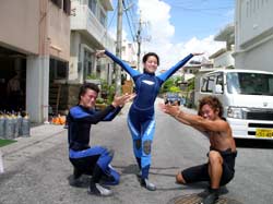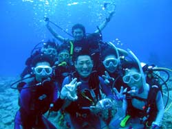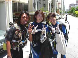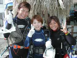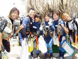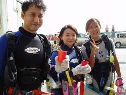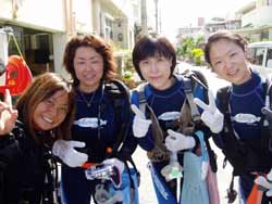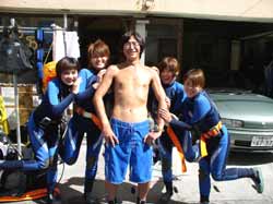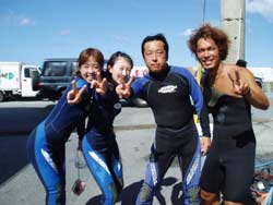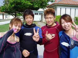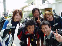 今日は体験ダイビング番長です。まずは可愛い女の子ノゾミちゃん、ともこちゃん、あゆみちゃん、ゆみちゃんの4名!とってものりのいいすっごくいい子達で 海海、きゃーきゃー、魚魚、きゃーきゃーニモニモきゃーきゃー サンゴサンゴキャーキャー とってもにぎやかで 僕も高野さんも取っても楽しかったですよ。みんな上手かったので また 沖縄にも遊びに来て下さいね。そしてまた きゃーきゃー言ってくださいね。沖縄の青い海でまってるよ〜〜!! |