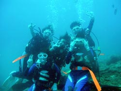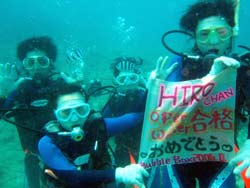 はい!こんにちは!今日はまたまたダイバーの仲間入りが誕生しましたヨ!!(^0^)/二日間とゆうハードスケジュールの中がんばってスキルと学科をこなしていきました!!遊びに来てくれたのは、関西出身の東京在住のふるーこと、三木奮君!!ミキプルーンみたいでおいしいそう・・(^^*)そして前回OWを取りに来てくれたバウの彼女さん!カンカンこと高宮真貴子ちゃん!!カンカンは昨日の午後からだったのでほとんど1.5日で講習をしていたのでよくがんばったよね(^^)でも二人とも海は上手!!エア持ちもよく、マスク脱着もスムーズにやっていきましたね!カンカンは耳抜きもよくがんばっていたね☆今回はハードだったので大変だったかも知れないけど、次回は一緒にゆっくりダイビングしよ!!ふるーは噂によると夜のふるーと昼のふるーは別人みたいなので次回遊びに来たときは飲みましょうね!!(笑)とゆうわけで二人ともOW合格です!!おめでと〜〜〜!!また遊びにきてね!!♪♪ |
