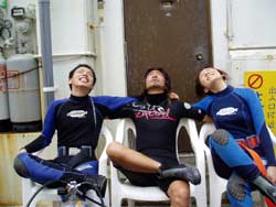こんにちはぁ☆今日はAOWチームで潜ってきました!メンバーは昨日からのヒロキくん&エリコちゃん。4月ぶりのカズヨさん→高校からのお友達で小学校の先生をしている古川Teacher。6月に5年ぶりのダイビングをしダイバー復活のオゴちゃん&マッキーの計6名でっす!!まず1本目は砂辺で頑張って、頑張ってDeepダイビング!みんなのダイブコンピューターの比較や圧力&色の変化の確認実験をしてきました☆そして2本目はみなさん苦手意識のあるコンパス・・・しかぁし全然平気でしたね!あまり透明度の良くない中、しっかりスタート地点に戻ってきていました!そして、そして学科を頑張った後はさらにナイトダイビングをしてきましよ☆日中潜った砂辺なのに雰囲気が違いましたね〜!ライトを照らすとエビの目がキラキ★そして、このダイブを終了し、ヒロキ君&エリコちゃんは4人より一足お先にAOWの合格で〜す!!!おめでとぉ〜♪&お疲れ様ぁ☆次はぜひ純粋なFUNダイビングを楽しみに来てね!待ってまぁ〜す☆ |