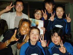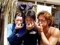 12時からはナイスカッポー磯&磯チームともぐりました。小学校の先生をしている、かわいい磯部祥子ちゃん&そうは見えないけど(??)国語の先生磯原伸成さんです。初めてのダイビングに挑戦ですが、てんで余裕の2人です。水中はいってすぐに、スイスイすーいってニコニコしながら泳いでた。なので、いつもより長めにあそんでしまった。。。本物のニモに会いにいったら、超小さいベイビーニモや更にタマゴまでみれました。ツユべラのオレンジ色の幼魚とカラフルな大人の両方をみれたし(←学校に魚の図鑑あったら、みてみて)おひげの『おじさん』っていう魚や、おしいしそうなイカも発見!観音様にお願い事をしたり、穴をくぐったりもしちゃった。初めてのダイビングはどうでした?来年の夏休みは、ライセンスゲットか!?2人と潜れてたのしかったです。また遊びにきてね!またんめんそ〜れ〜。 |